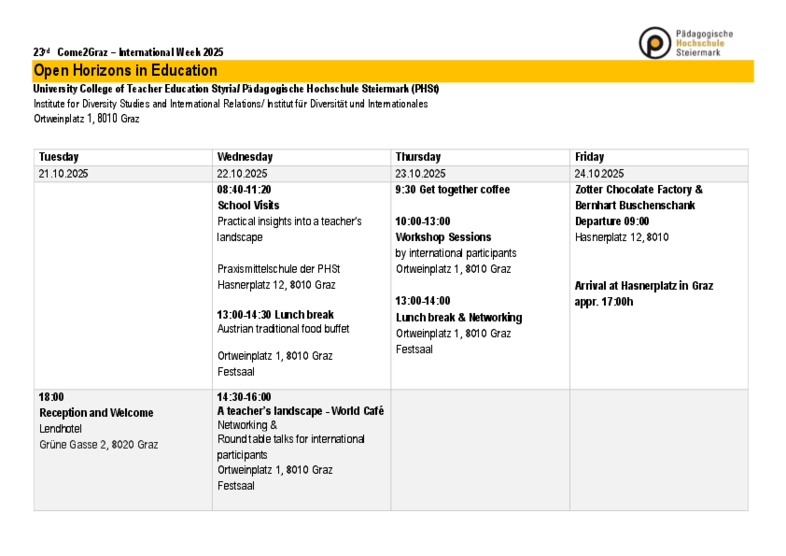 Die 23. Come2Graz International Week findet von 21. Oktober - 24. Oktober 2025 statt - das diesjährige Thema lautet "Open Horizons in Education.".