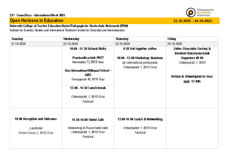 Die 23. Come2Graz International Week findet von 21. Oktober - 24. Oktober 2025 statt - das diesjährige Thema lautet "Open Horizons in Education.".