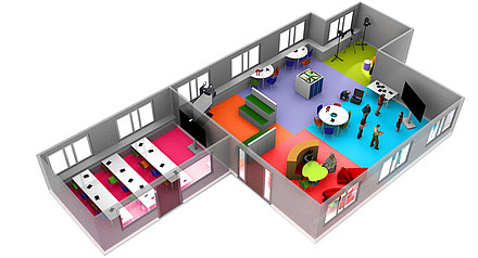- Livingroom: Raum für informelles, selbstgesteuertes Lernen und Nachdenken, unterstützt individuelle Interessen und personalisierte Lernansätze durch gemütliche Atmosphäre und mobiles Equipment.