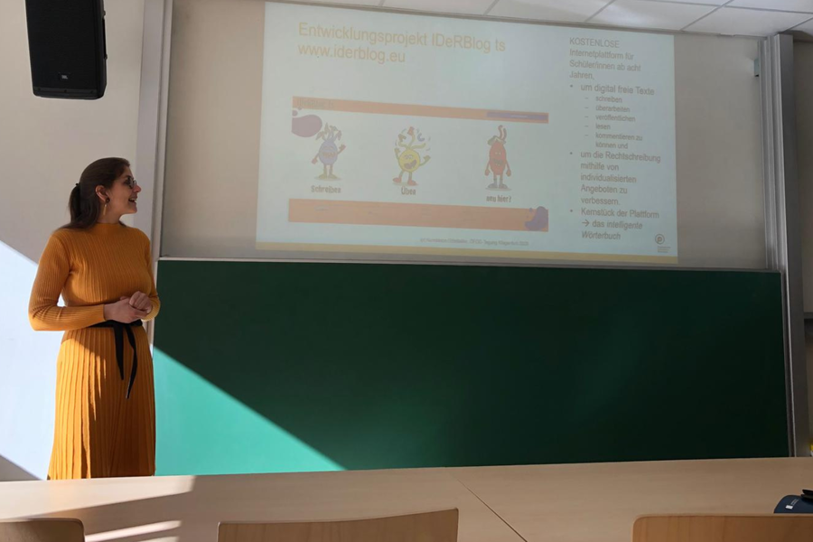 HS-Prof.in Dr.in Konstanze Edtstadler stellte dabei ihre corpusbasierten Forschungsergebnisse zu schwierigkeitsbestimmenden Merkmalen der deutschen Orthographie vor und skizzierte, wie diese im Rahmen des Gamification-Projekts zu IDeRBlog ts praxisorientiert genützt werden. Außerdem moderierte sie eine Sektion und hielt, in Kooperation mit der PH Kärnten, einen Workshop zur Transition im Kompetenzbereich (Recht-)Schreiben von der Primar- auf die Sekundarstufe.